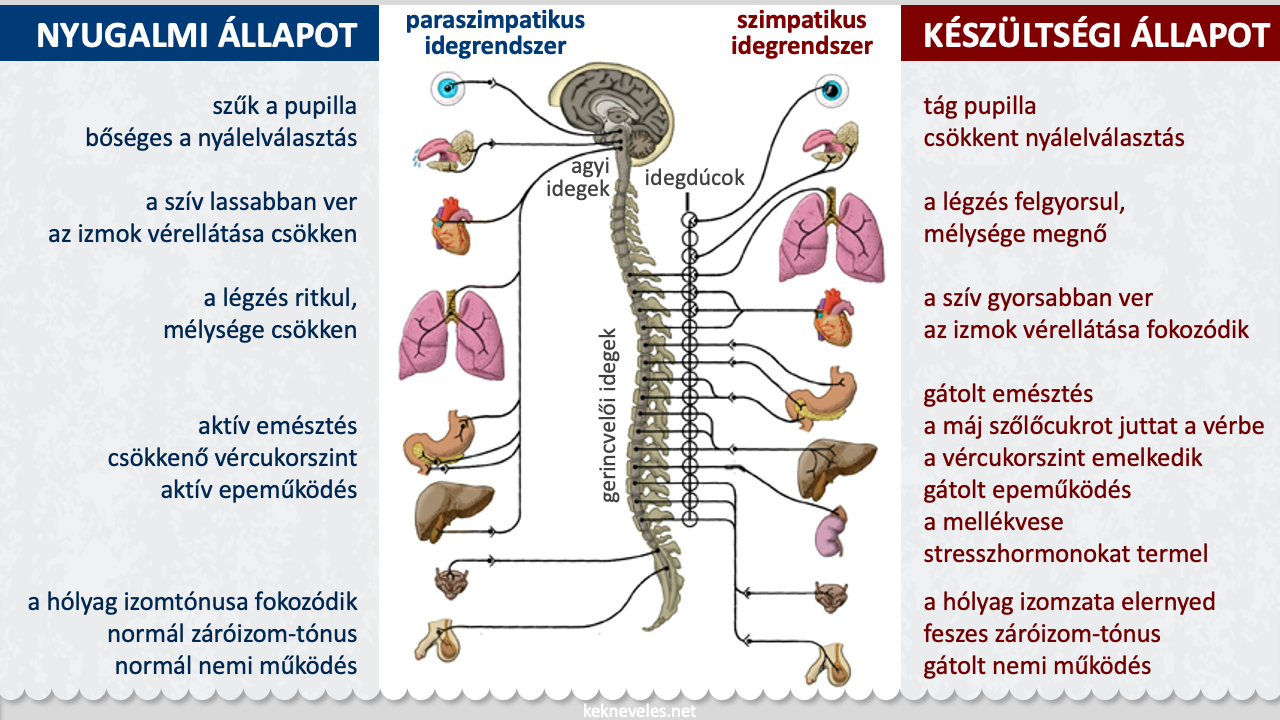A vegetatív vagy autonóm idegrendszer két részből áll: a szimpatikus idegrendszer stresszhelyzetben aktiválódik. Egész szervezetünket munka-üzemmódba állítja, amikor össze kell szednünk magunkat: dolgozunk, sportolunk, vagy veszélyt jelez a riasztórendszerünk. A paraszimpatikus idegrendszer pedig az egyensúly helyreállásáról szól. Idegrendszerünk nyugalmi állapota nemcsak azt teszi lehetővé, hogy pihentető alvásba merüljünk, hanem azt is, hogy felszabadultan játsszunk és alkotás vagy problémamegoldás alkalmával eredeti ötletek jussanak eszünkbe.