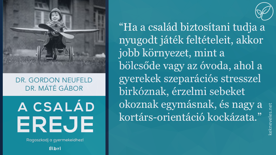 Az óvoda és az iskola fontos szerepet tölt be a társadalom szövetében, de nem az a hely, ahol az emberi potenciál megvalósulása történik. Nem jó irány, ha arra vagyunk kényszerítve, hogy a családi életet az óvoda és az iskola alá rendeljük. Sajnos még a szülői szerepünket is az intézményekhez igazodva képzeljük el, mert elhisszük, hogy legjobban a szakszerű intézményi nevelés fejleszti a gyerekeket. Sokat adhatnak ezek a helyek, de pont a fejlődés alapfeltételeit nem tudják a kellő mértékben megadni: a biztonságot nyújtó kapcsolatot, a lelki nyugalmat, valamint biztonságos kereteket az érzelmek és indulatok kifejezéséhez és a szabad játékhoz. Ezeket az átlagos szülők jobb eséllyel tudják megadni a saját gyerekeiknek, mint az intézmények. Ahol egész nap egyszerre sok gyerek testi- és lelki épségét kellene megőrizni, ott ezek a feltételek egyszerűen nem megvalósíthatók. Kizárják egymást. Ezért nem tesz jót a felnövekvő generáció lelki egészségének, teherbíróképességének, alkotókészségének és a civilizált együttélésre való képességének, ha a gyerekek nem csak napi 4-6 órát, hanem szinte az egész napot intézményes keretek között, nagylétszámú gyerekcsoportokban töltik.